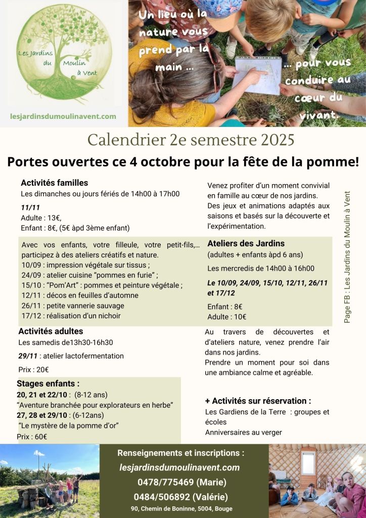 Avec vos enfants, votre filleule, votre petit-fils,… les mercredis de 14 à 16h00, participez à nos ateliers créatifs sur la biodiversité, les saisons, les animaux, le verger,… tels que la construction de refuges pour oiseaux ou insectes, la préparation de semis, la découverte de plantes sauvages comestibles… N’hésitez pas à consulter la page « nos activités ».