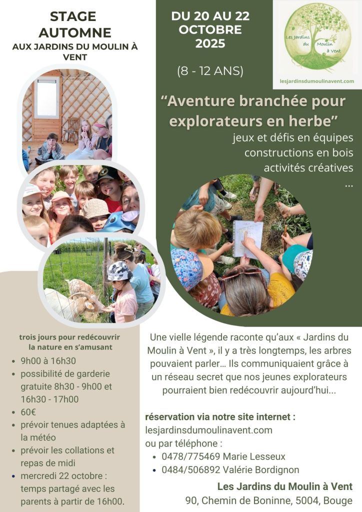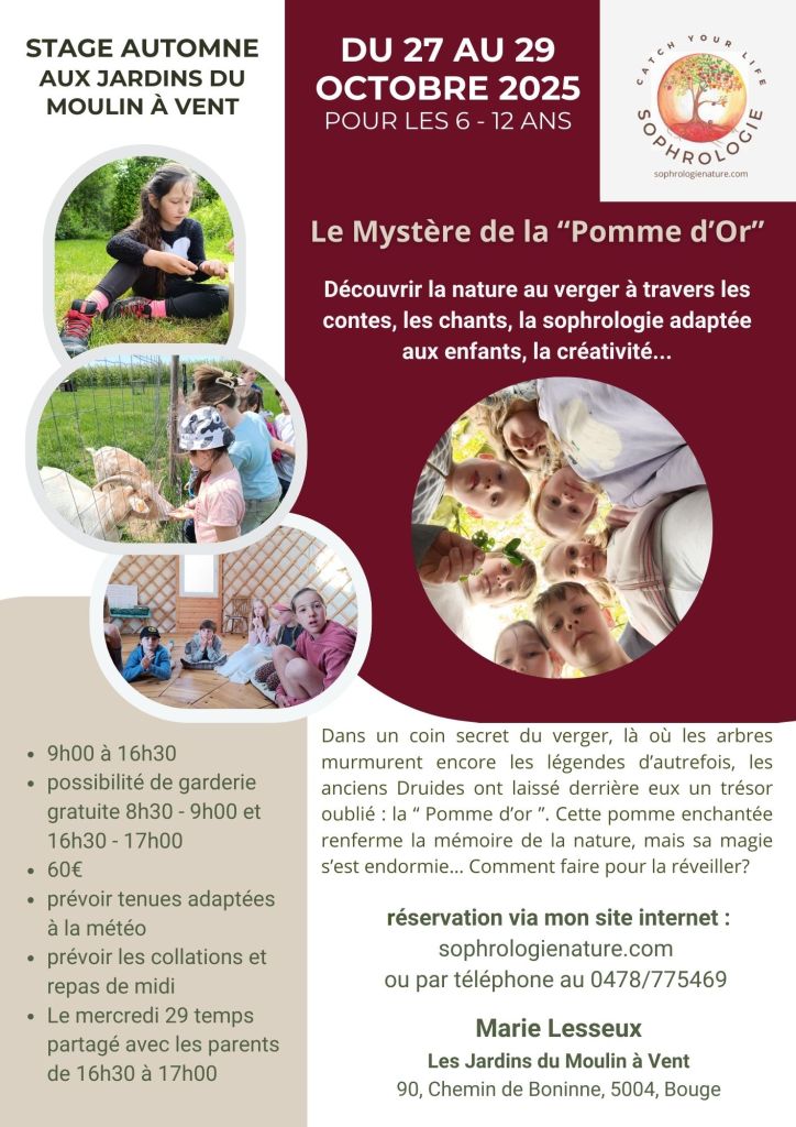 Trois jours pour explorer la nature au verger à travers les jeux, l’observation et la créativité. Apprivoiser et se laisser apprivoiser par les occupants de la « Petite Ferme ». Prendre sa place dans le groupe et partager de bons moments dans le cadre accueillant des Jardins du Moulin à Vent.